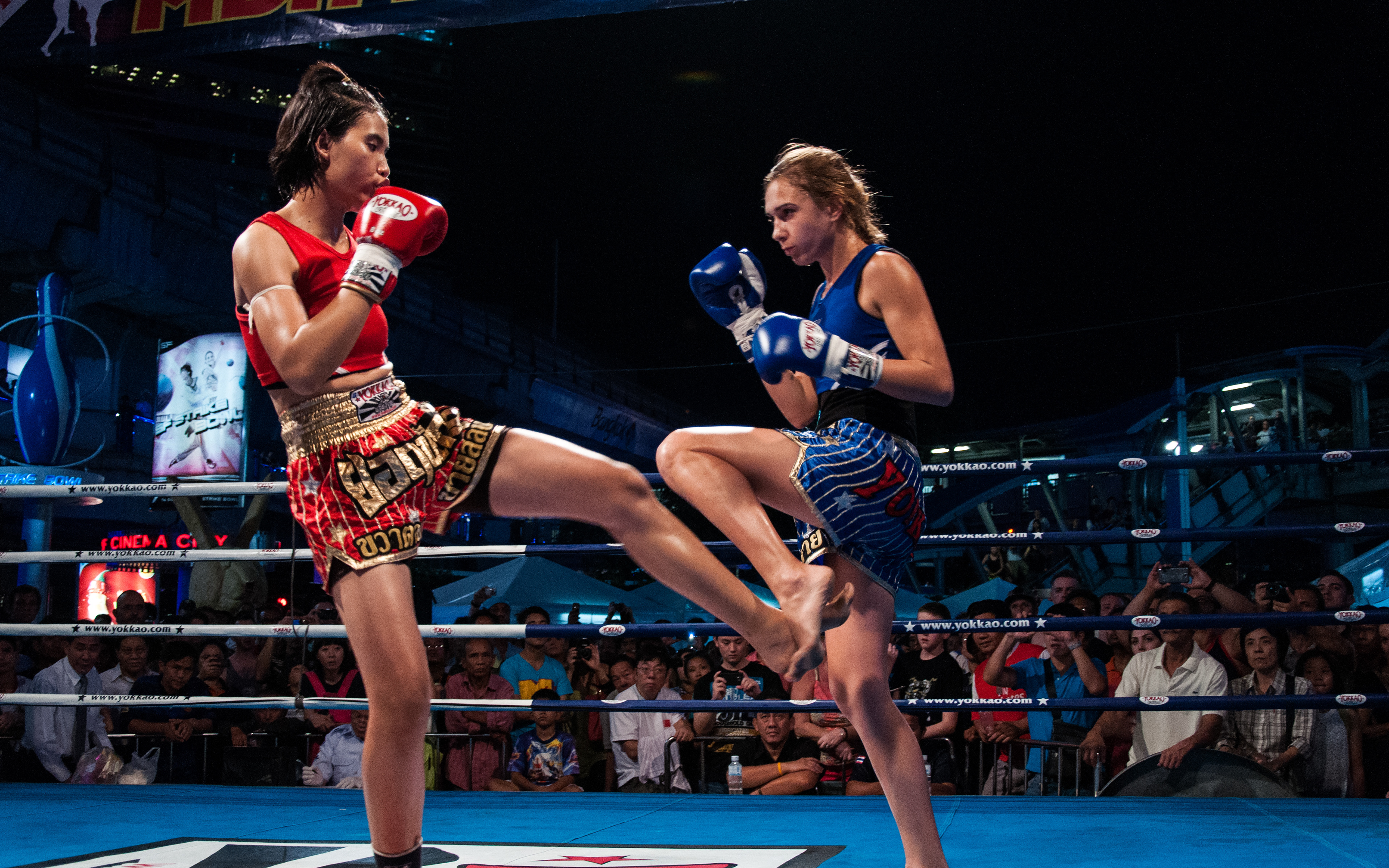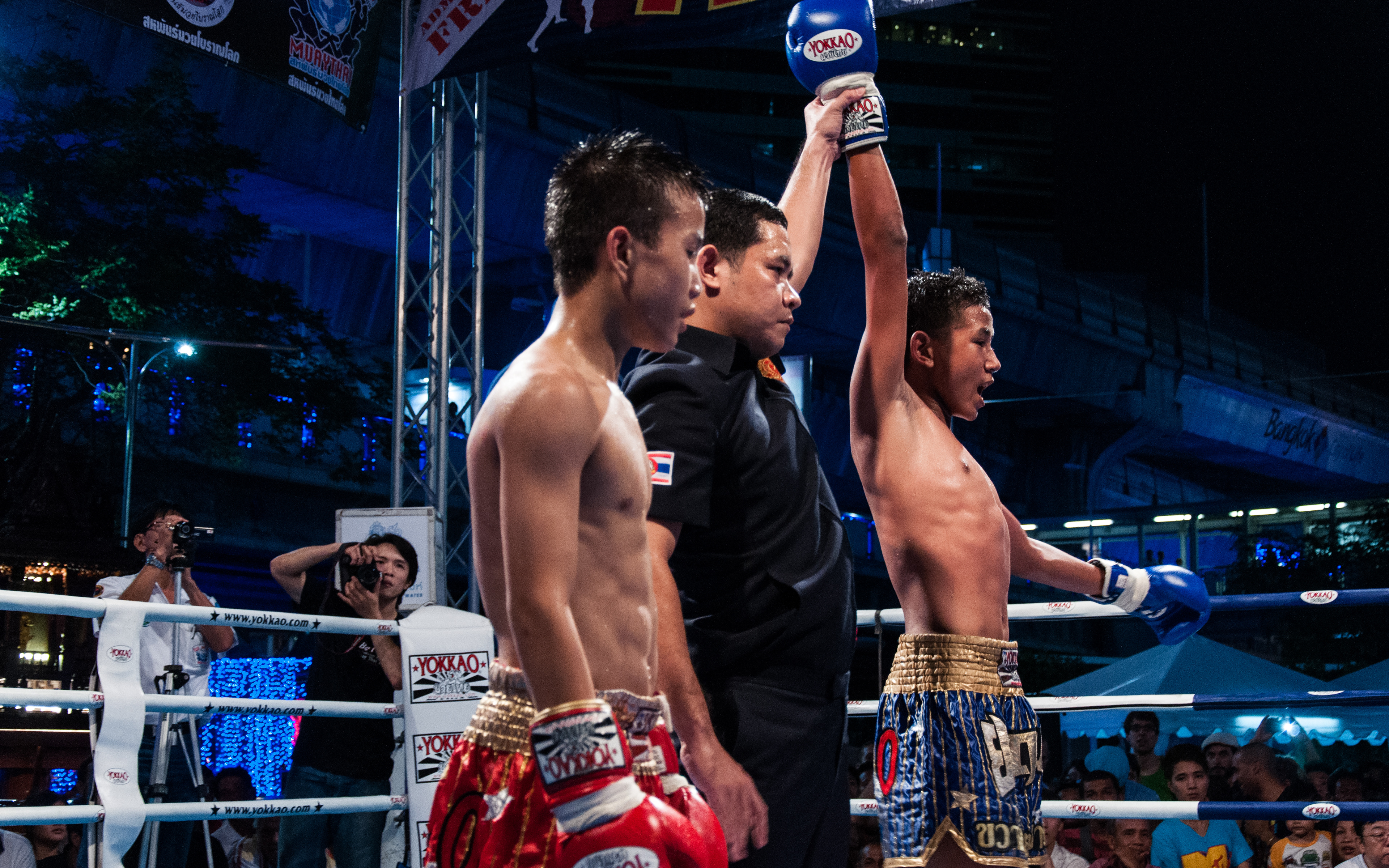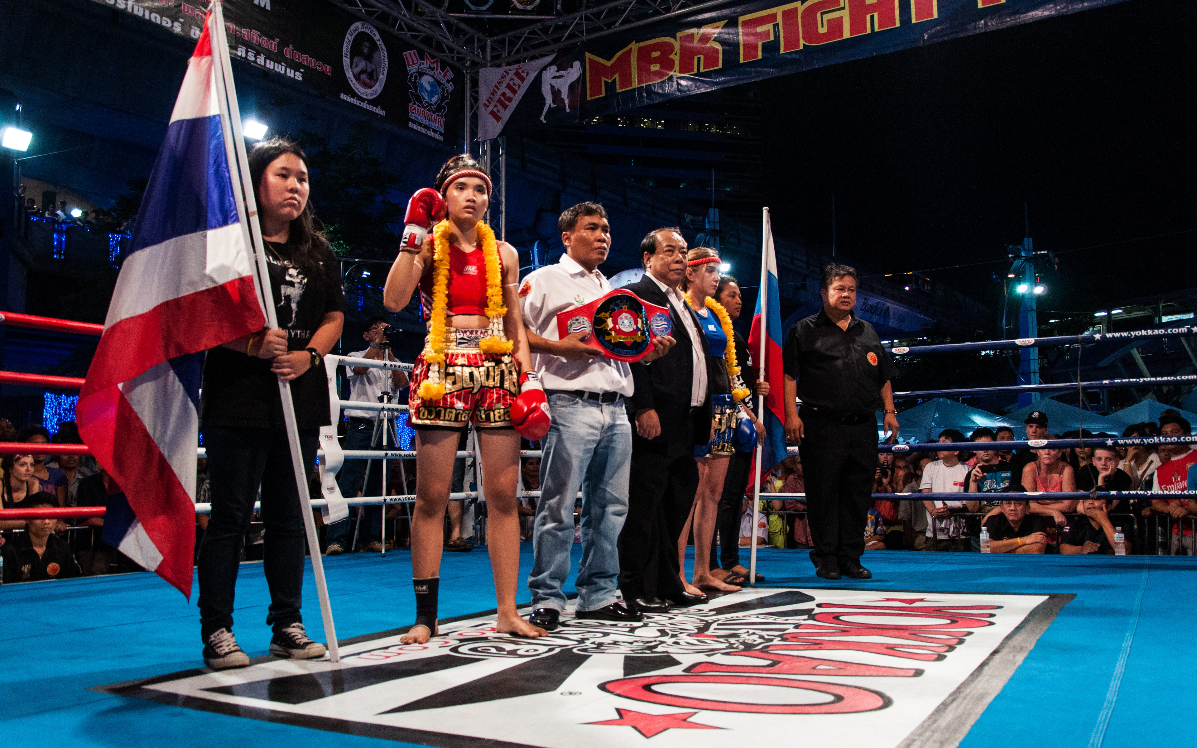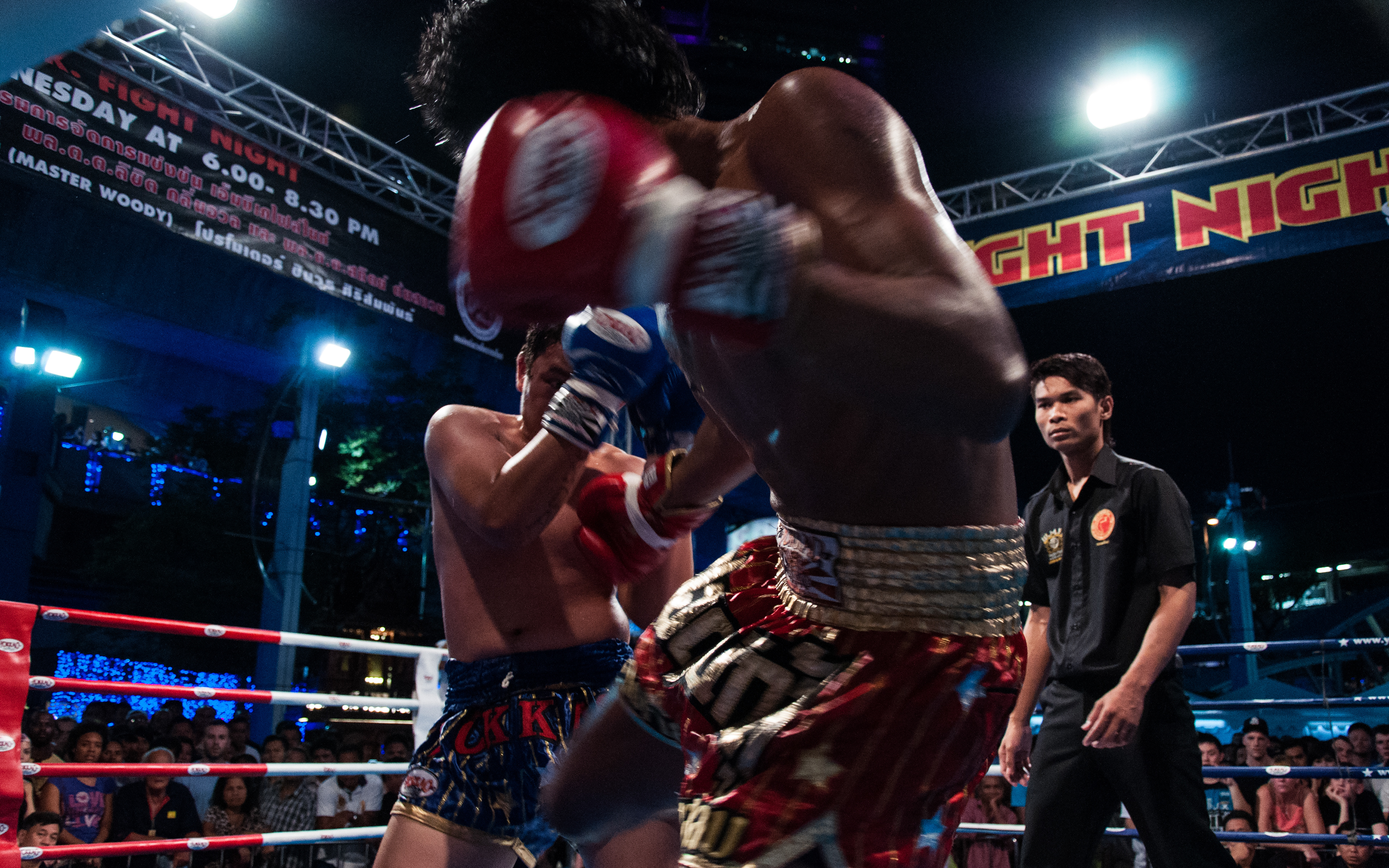 Gala de boxe thaïlandaise devant le centre commercial MBK, à Bangkok.